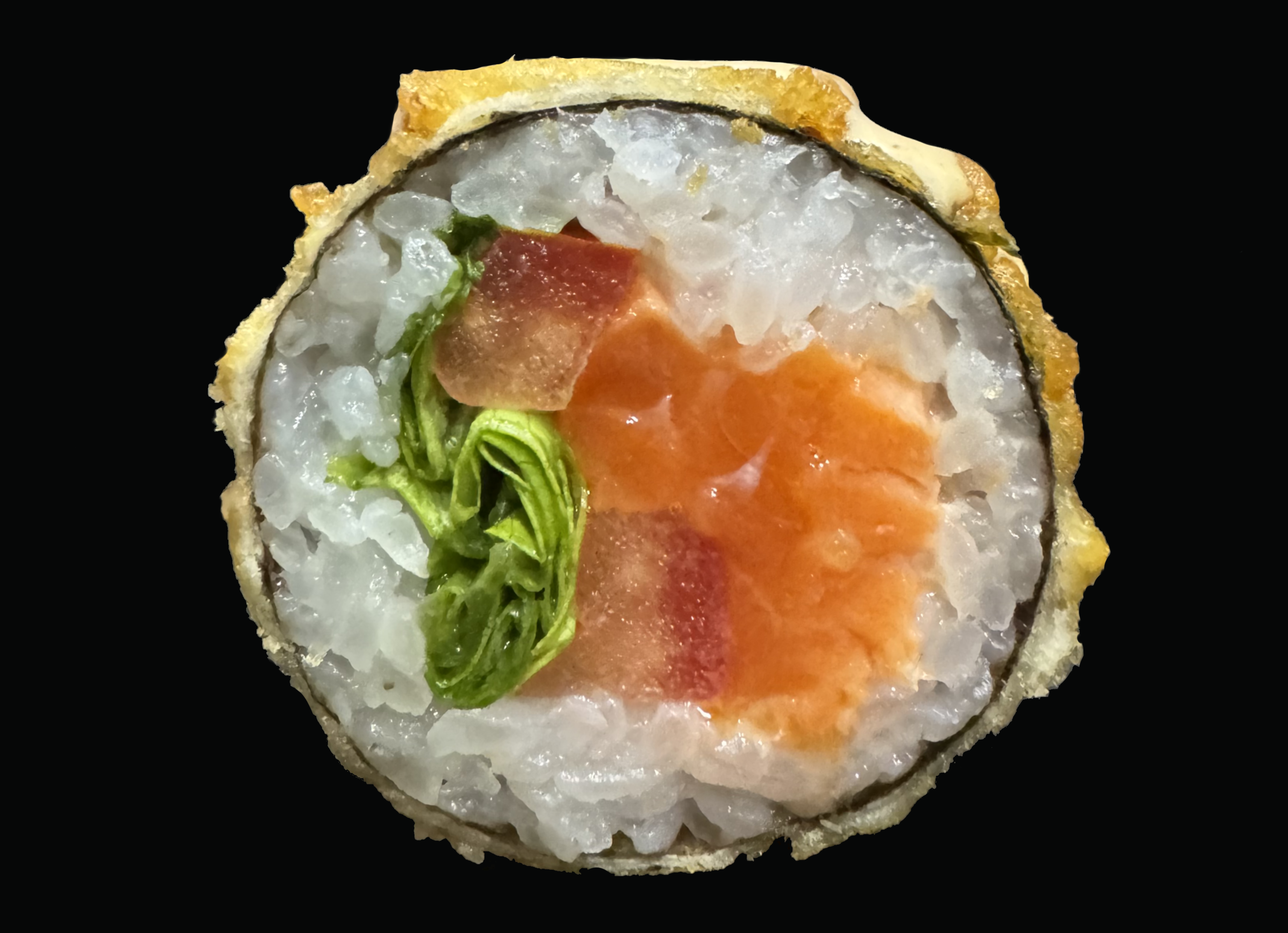 Гострий гарячий рол у темпурі з лососем, листя салату, помідором та соусом спайсі