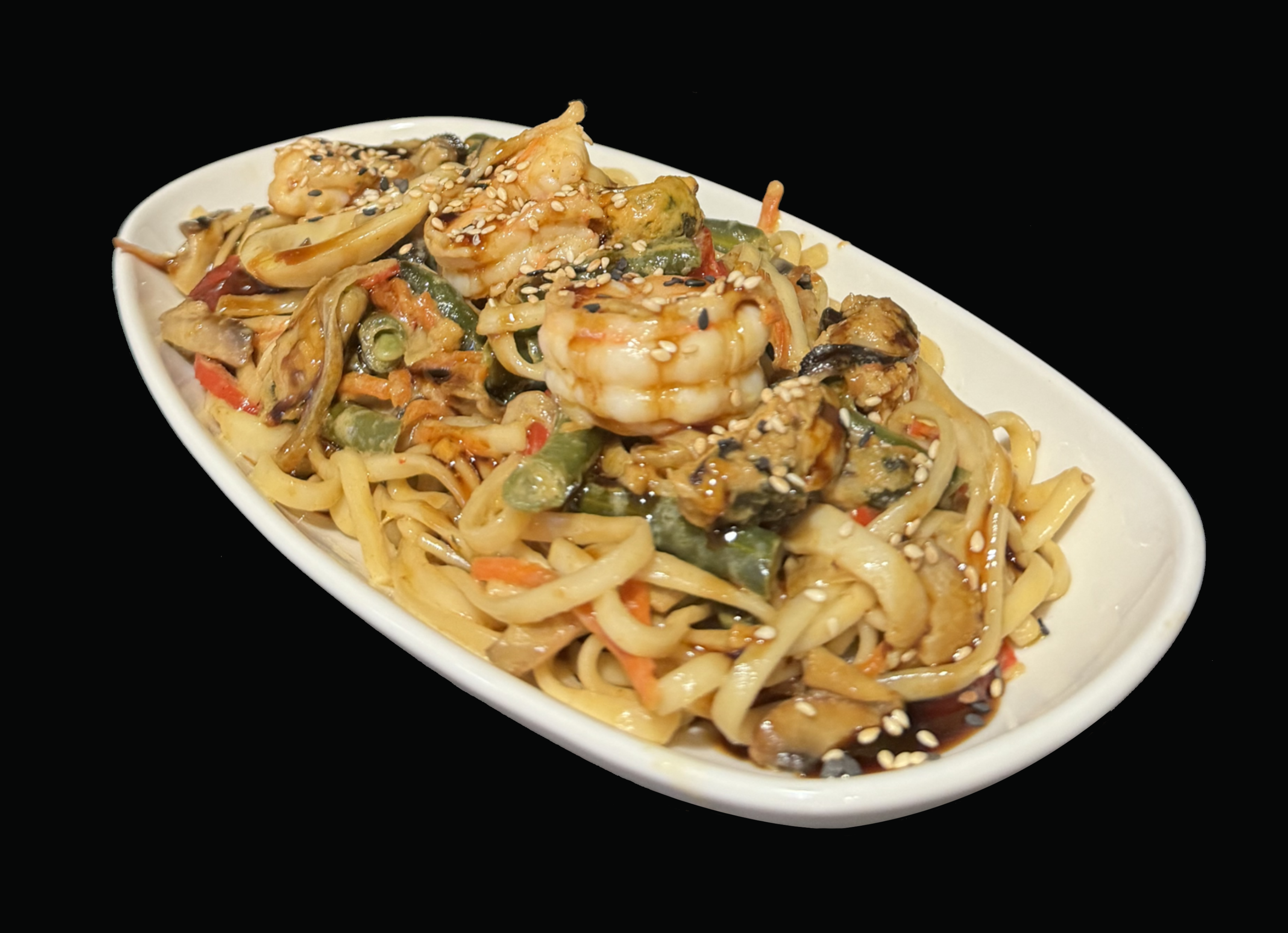 Локшина»Удон», морепродукти, квасоля стрючкова , перець болгарський, печериці, морква, цибуля, соус унагі, кунжут.