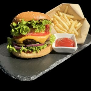Соковита котлета з яловичини , бекон, соус «BBQ», цибуля томат, огірок, салат мікс , подвійний сыр «Чеддер»+ картопля фрі + кетчуп + Напій 0,33 Вага...
