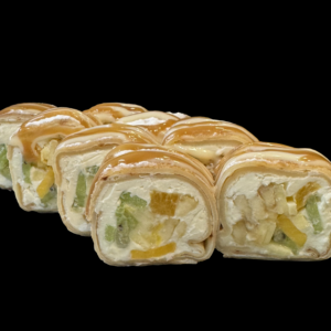 Ванільний млинець,вершковий сир, цукрова пудра, яблуко,банан,ківі,манго, топпінг,кокосова стружка Вага — 300 гр.