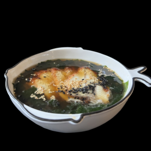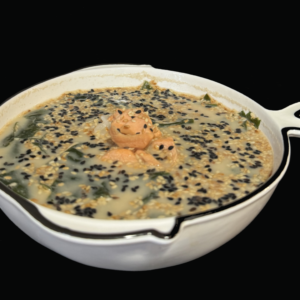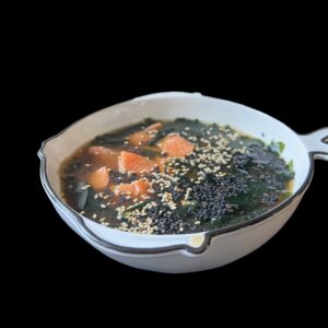 Вершковий суп на основі бульйону суімоно, водорості вакаме, лосось, кунжут, рис. Вага — 350 гр.
