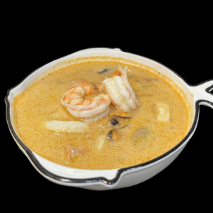 Кокосовое молоко, креветка, кальмар, мидії томати, лосось, печериці, лист каффір-лайма, перець Чилі, часник, имбир. Вага — 450 гр.