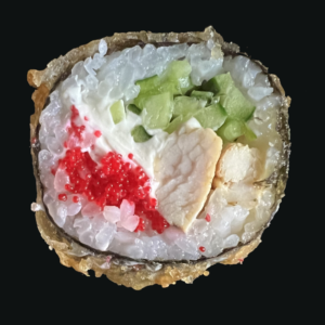 Рол в темпурі з куркою гриль, вершковий сир , огірок , ікра тобіко. Вага- 310гр.