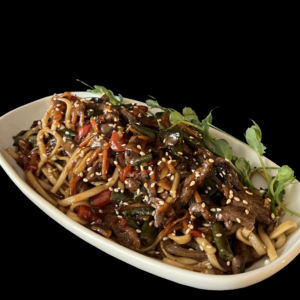 Локшина «Удон», куряче філе, морква, цибуля, печериці, квасоля стручкова , перець болгарський , соус унагі, кунжут. Вага- 340 гр.