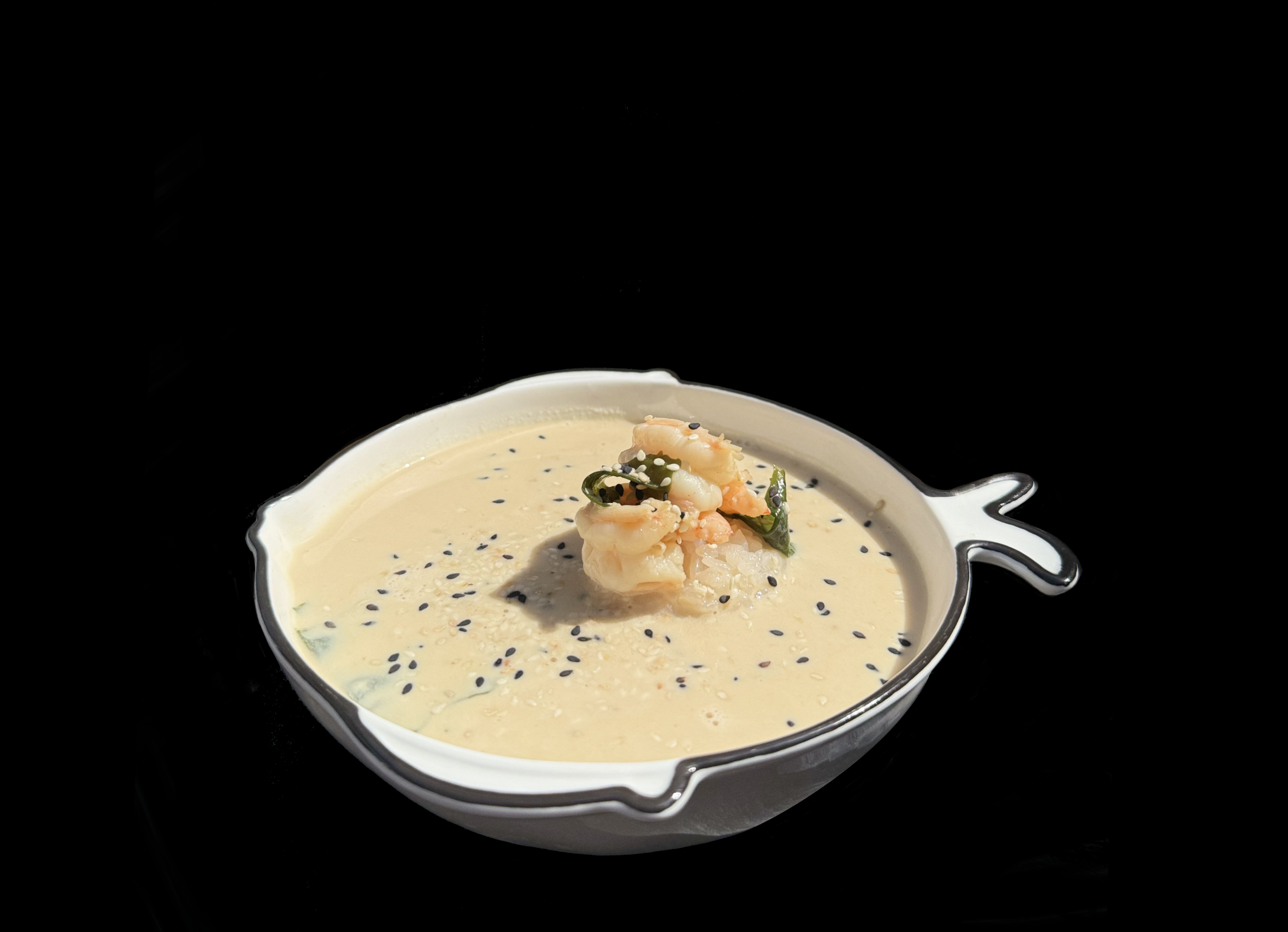 Вершковий суп на основі бульйону суімоно,водорості вакаме,креветка тигрова,кунжут,рис вага: 350 гр